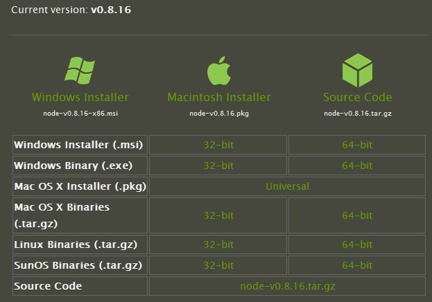 进入官网的下载地址:http://www.nodejs.org/download/ 。 选择Windows Installer或者选择Windows Installer (.msi) 32-bit,下载安装包。 下载完成后,双击安装。