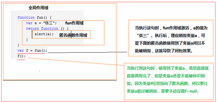 var f = fun();//同样,在我们执行完后,变量a就被标记为销毁了