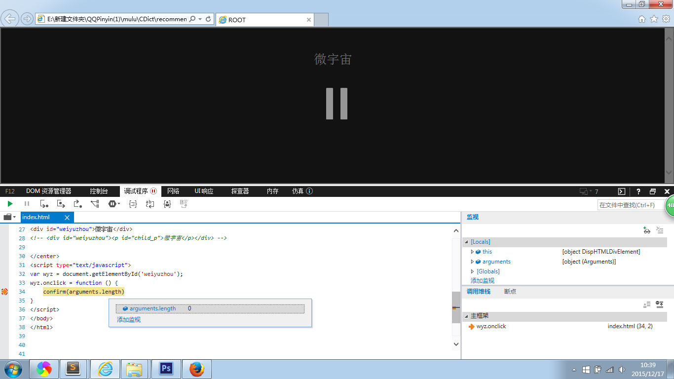 确保上面这些步骤都没问题的话,我们才可以继续的往下走,然后我们在IE浏览器(低版本)看到弹出0,确切的说,IE8以下(包含IE8)的弹出0,反之弹出1。接着我在firefox浏览器看到弹出1。也就是说在IE8以下版本事件的触发不存在于函数的作用域内部,是不是说IE8以下的事件触发发生在全局作用域中,此处留个悬念,但是,可以肯定的是IE8以下事件的方法并没有这个Event参数,也就是说arguments的长度为0,如下视图5-02所示: