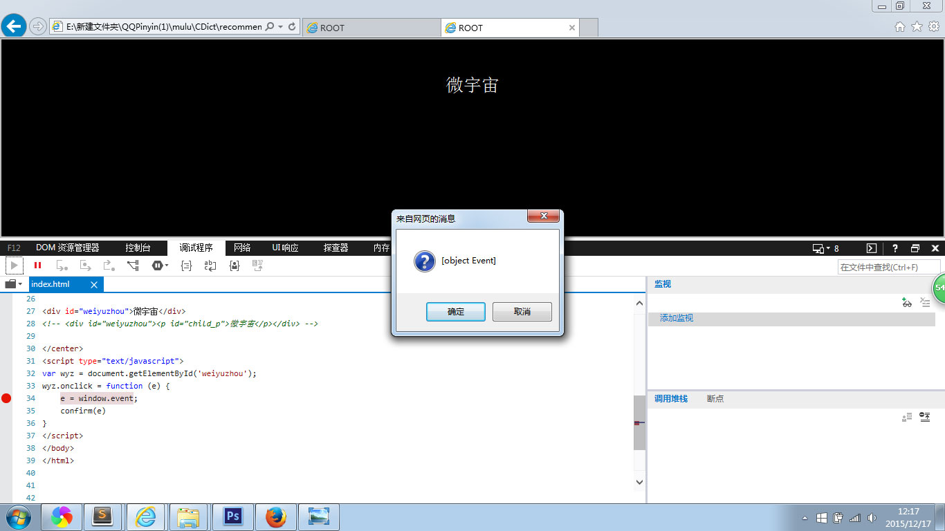 接下来在IE8下测试发现addEventListener错误,但是看到window下有此类方法(尝试了一下,原来此类方法在IE9以上版本是可以被支持),IE8同时还有一个attachEvent(event, pdisp),那么我们设置监听事件wyz.attachEvent('onclick',function(e){confirm(e + 'e')}),注:event为'onclick',紧接着在IE8下点击发现可弹出二次,最后一次eIE。此时on('click',pdisp)和attachEvent(event,pdisp)可以共同使用。