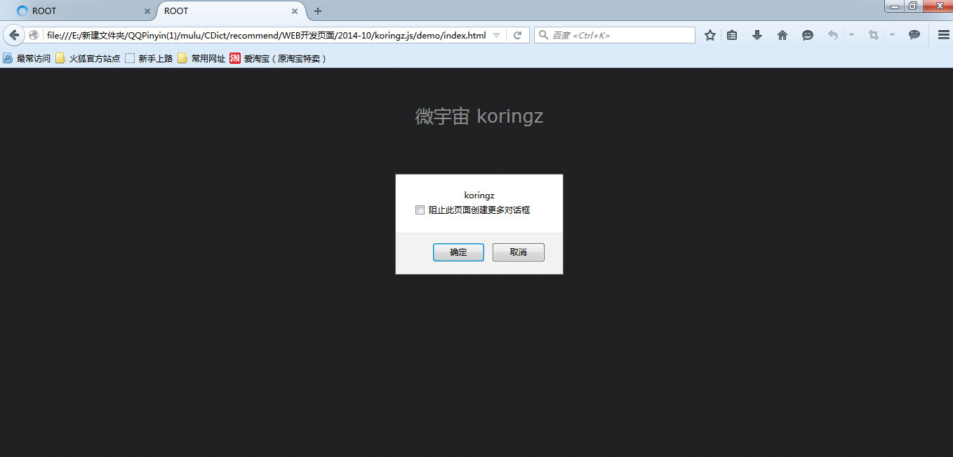 当我分别在IE8和firefox下点击容器的内容,出现了怪异的情况,在firefox浏览器的窗口上点击时,点击中文文本内容弹出来对话框‘微宇宙',我再点击koringz时,发现弹出了二次对话框,弹出内容都为'koringz',那是因为我点击子容器的时候触发了上一层的点击行为,如何解决点击koringz弹出二次对话框的问题,了解一点js的程序员都知道这是冒泡事件。