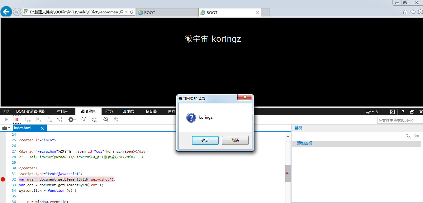 还是以上一个页面的块为例,现在我继续往块<div id="weiyuzhou">微宇宙</div>增加一个子容器,这个子容器为行内元素<span id='coz'>koringz</span>,取id名为coz,然后给这个元素也加一个点击事件代码同上函数,为了能区别开文本内容之间的差异。