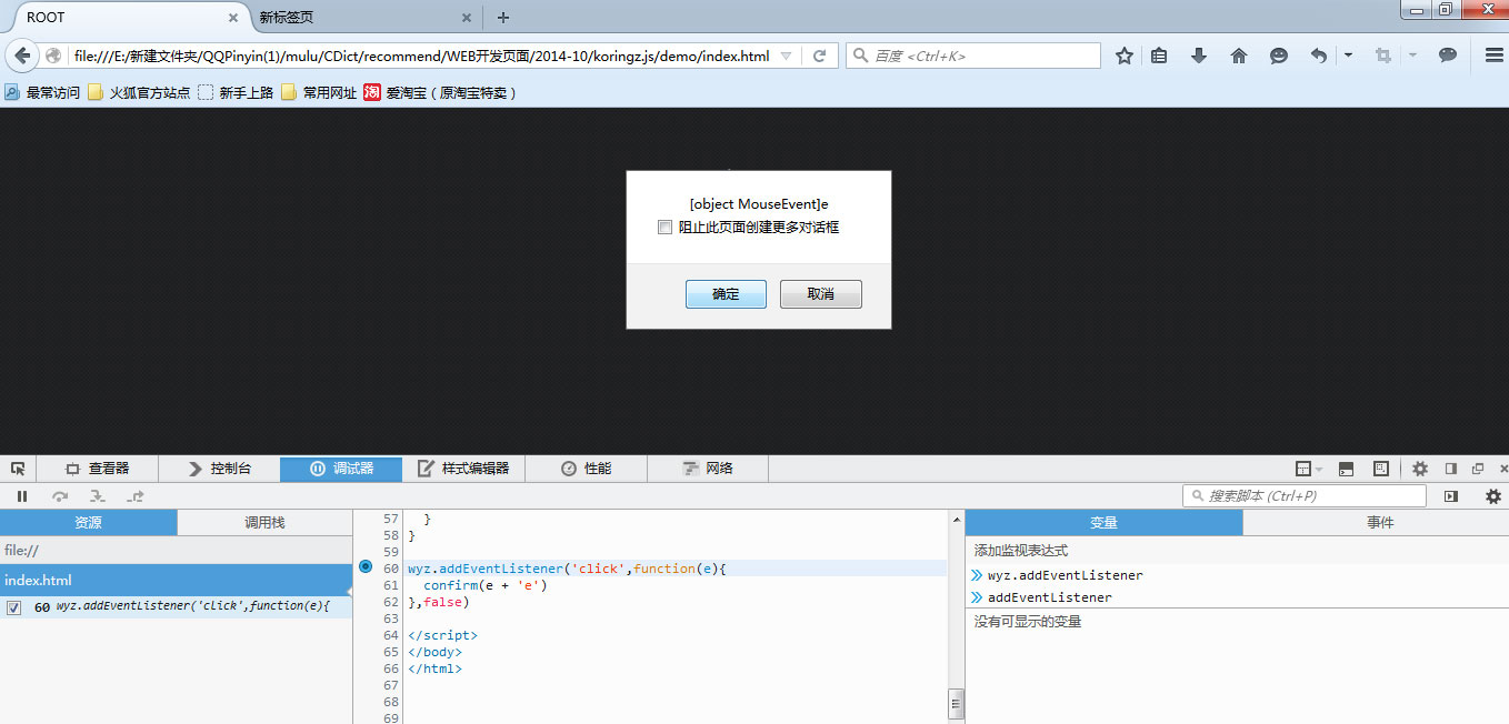 在firefox下的window包含有addEventListener(type, listener, useCapture)的方法,随后我们在<script type="text/javascript"></script>内部定义此监听事件domElement.addEventListener('click',function(e){confirm(e+'e')},false);,接着在firefox浏览器点击内容弹出二次,最后一次弹出为[object MouseEvent]e,后面多了一个e,这是我有意加上用以区别的。如图5-08所示。