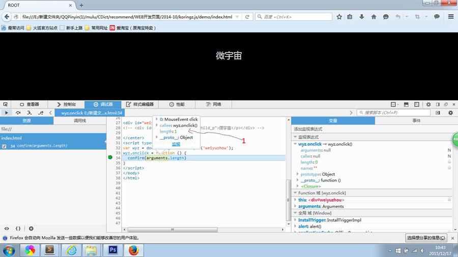 于是,我们看firefox浏览器窗口弹出1,说明事件存在于函数内部,再次证明方法的内部数组arguments长度为1,并且是可枚举的变量,也可以说可写,如下视图所示。