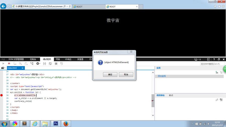 经由以上分析,我们查找发现firefox下的event有我们需要的方法名可以被调用,当然,我们查找发现IE8下面的srcElement也有我们所需的方法名可以被调用,于是乎,呵呵!看到这里你的内心是不是有点小激动,一步步排除,最后发现也没有什么难的。回到正题,现在我们声明一个变量vare_child=e.srcElement||e.target;然后我们在IE8和firefox浏览器上看到对话框信息都为[objectHTMLDivElement],如图所示。