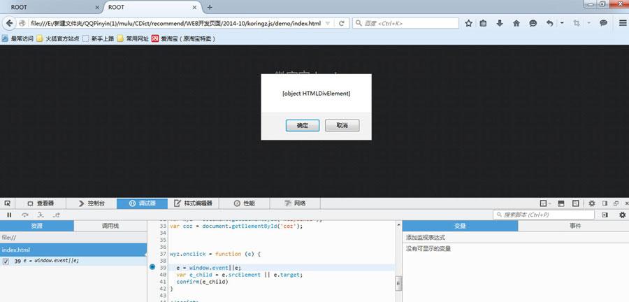 在firefox下的window包含有addEventListener(type,listener,useCapture)的方法,随后我们在<scripttype="text/javascript"></script>内部定义此监听事件domElement.addEventListener('click',function(e){confirm(e+'e')},false);,接着在firefox浏览器点击内容弹出二次,最后一次弹出为[objectMouseEvent]e,后面多了一个e,这是我有意加上用以区别的。如图所示。