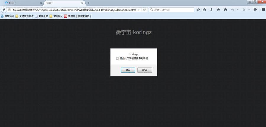 当我分别在IE8和firefox下点击容器的内容,出现了怪异的情况,在firefox浏览器的窗口上点击时,点击中文文本内容弹出来对话框‘微宇宙',我再点击koringz时,发现弹出了二次对话框,弹出内容都为'koringz',那是因为我点击子容器的时候触发了上一层的点击行为,如何解决点击koringz弹出二次对话框的问题,了解一点js的程序员都知道这是冒泡事件。