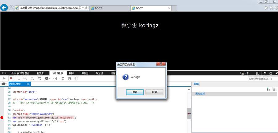 因为IE8下global包含的event属性cacelBubble不是一个方法,而是一个输出布尔值的对象,所以这个和firefox有所不同,只是firefox把此事件封装成方法而已。好了,现在我们给第二次点击的事件代码块之后再加一行代码e.cancelBubble=true;然后在IE8浏览器下测试,之后再点击koringz发现也弹出一次。如图所示