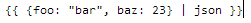 {{ {foo: "bar", baz: 23} | json }}