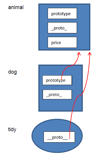 这说明什么问题呢,执行dog.price的时候,发现没有price这个属性,虽然prototype指向的animal有这个属性,但它并没有去沿着这个“链”去寻找。同样,执行tidy.price的时候,也没有这个属性,但是__proto__指向了animal,它会沿着这个链去寻找,animal中有price属性,所以tidy.price输出2000。由此得出,原型链的真正形成是靠的__proro__,而不是prototype。