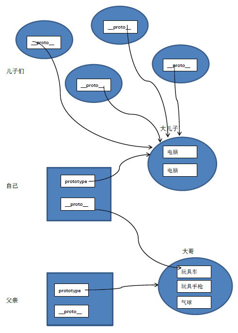 父亲(函数对象),先生了一个大儿子(prototype),也就是你大哥,父亲给你大哥买了好多的玩具,当你出生的时候,你们之间的亲情纽带(__proto__)会让你自然而然的拥有了你大哥的玩具。同样,你也先生个大儿子,又给他买了好多的玩具,当你再生儿子的时候,你的小儿子会自然拥有你大儿子的所有玩具。至于他们会不会打架,这不是我们的事了。