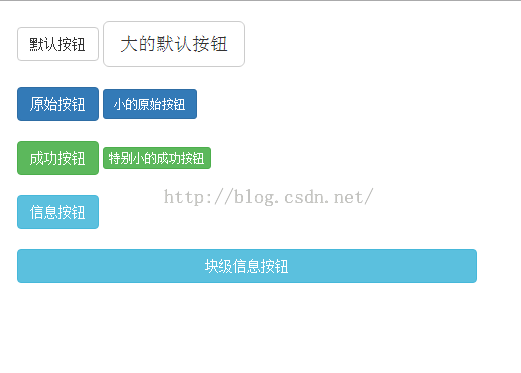 <body style="padding: 20px;width:500px;"> <!-- 标准的按钮 --> <button type="button" class="btn btn-default">默认按钮</button> <button type="button" class="btn btn-lg btn-default">大的默认按钮</button> <br/><br/> <!-- 提供额外的视觉效果,标识一组按钮中的原始动作 --> <button type="button" class="btn btn-primary">原始按钮</button> <button type="button" class="btn btn-sm btn-primary">小的原始按钮</button> <br/><br/> <!-- 表示一个成功的或积极的动作 --> <button type="button" class="btn btn-success">成功按钮</button> <button type="button" class="btn btn-xs btn-success">特别小的成功按钮</button> <br/><br/> <!-- 用于要弹出信息的按钮 --> <button type="button" class="btn btn-info">信息按钮</button><br/><br/> <button type="button" class="btn btn-block btn-info">块级信息按钮</button> </body>