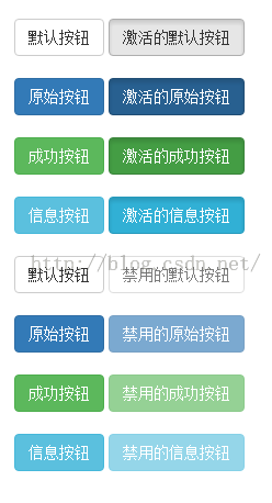 <body style="padding: 20px;width:500px;"> <!-- 标准的按钮 --> <button type="button" class="btn btn-default">默认按钮</button> <button type="button" class="btn btn-default active">激活的默认按钮</button> <br/><br/> <!-- 提供额外的视觉效果,标识一组按钮中的原始动作 --> <button type="button" class="btn btn-primary">原始按钮</button> <button type="button" class="btn btn-primary active">激活的原始按钮</button> <br/><br/> <!-- 表示一个成功的或积极的动作 --> <button type="button" class="btn btn-success">成功按钮</button> <button type="button" class="btn btn-success active">激活的成功按钮</button> <br/><br/> <!-- 用于要弹出信息的按钮 --> <button type="button" class="btn btn-info">信息按钮</button> <button type="button" class="btn btn-info active">激活的信息按钮</button> <br/><br/> <button type="button" class="btn btn-default">默认按钮</button> <button type="button" class="btn btn-default disabled">禁用的默认按钮</button> <br/><br/> <!-- 提供额外的视觉效果,标识一组按钮中的原始动作 --> <button type="button" class="btn btn-primary">原始按钮</button> <button type="button" class="btn btn-primary disabled">禁用的原始按钮</button> <br/><br/> <!-- 表示一个成功的或积极的动作 --> <button type="button" class="btn btn-success">成功按钮</button> <button type="button" class="btn btn-success disabled">禁用的成功按钮</button> <br/><br/> <!-- 用于要弹出信息的按钮 --> <button type="button" class="btn btn-info">信息按钮</button> <button type="button" class="btn btn-info disabled">禁用的信息按钮</button> </body>