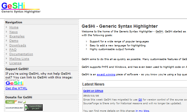 GeSHi(Generic Syntax Highlighter)用于在HTML页面中高亮显示各种源代码。支持超过60种语言:PHP、HTML、C、Java、Java5、C#、 Actionscript、Delphi、C++、Groovy、Javascript、Perl、PL/SQL、Ruby、Python、SQL、 XML等,并易于集成到 Dokuwiki,Mambo,phpBB,WordPress 和 WikkaWiki 等系统中使用。