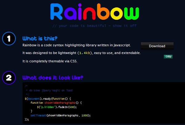 Rainbow 是一个对代码进行语法着色的轻量级 JavaScript 库,只有 1.4kb 大小。易用、可扩展、完全通过 CSS 进行样式显示。完全支持 CSS 主题定制颜色和字体。