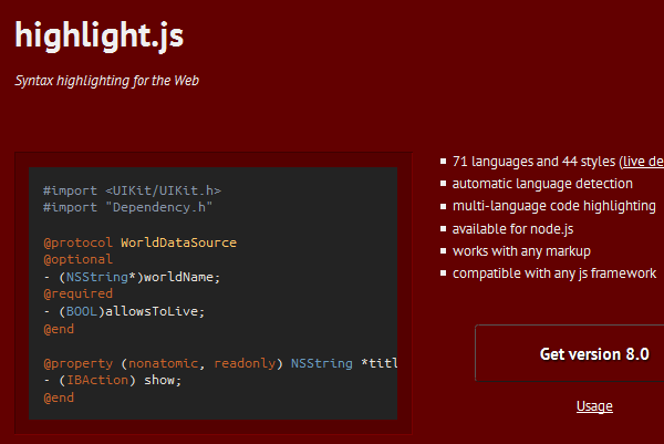 highlight.js是一款非常容易使用的高亮脚本,支持多种编程语言。它还有一些很有用的插件,很容易的部署到其它CMS、论坛或博客。