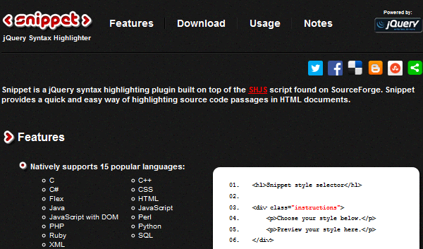 Snippet 是个 jQuery 语法高亮插件,在 SHJS 脚本中构建。Snippet 提供一个快速简单的方式来进行 HTML 文档的代码高亮。它原生支持 15 中流行语言,支持 39 种独特的语法高亮风格模式。