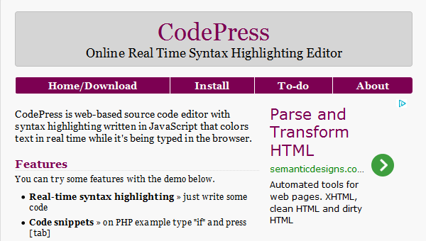 CodePress 是个基于 web 的源代码编辑器,当在浏览器中编写 JavaScriptis 代码的时候能实时的进行代码高亮。