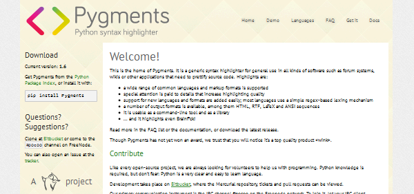 Pygments 是个通用代码语法高亮工具,许多常用的软件都使用了这款工具,比如论坛系统,wikis 或者其他需要美化代码的应用。 Pygments 支持范围非常广泛的编程语言,和大量的输出格式,包括 HTML, RTF, LaTeX 和 ANSI 序列。