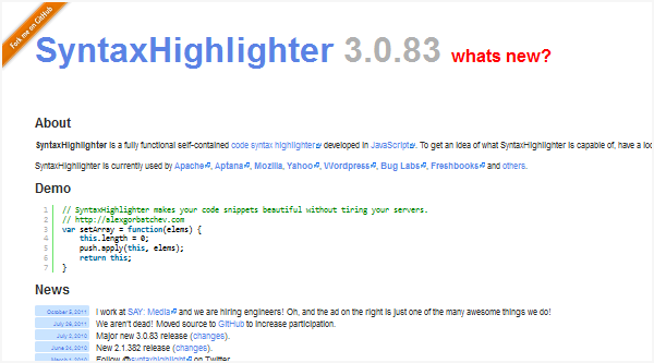 SyntaxHighlighter 是个功能齐全的独立代码语法高亮工具,使用 JavaScript 编写。目前已经得到了 Apache, Aptana, Mozilla, Yahoo, Wordpress, Bug Labs, Freshbooks 的一致认可,并且都在使用。