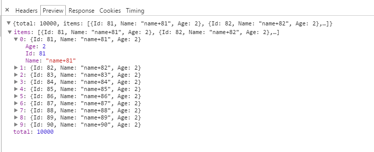 pageIndex和pageSize为插件默认的参数,在后台可以直接在Request中获取。特别需要注意的是插件的响应也是需要遵循特定的格式{"total":0,"items":[]},如上图中所示total代表数据总记录数,items代表分页的数据。