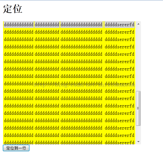 <body> <h1>定位</h1> <div id="dataDiv" style="overflow-x:hidden;overflow-y:auto;height:400px;width:450px;"> <table id="tableId" style="width:400px;background-color:yellow" align="center" border="0"> <tr><td>dddddddddddd</td><td>dddddddddd</td><td>ddddddddddddddddd<td/><td>dddddsererfd</td></tr> <tr><td>dddddddddddd</td><td>dddddddddd</td><td>ddddddddddddddddd<td/><td>dddddsererfd</td></tr> <tr><td>dddddddddddd</td><td>dddddddddd</td><td>ddddddddddddddddd<td/><td>dddddsererfd</td></tr> <tr><td>dddddddddddd</td><td>dddddddddd</td><td>ddddddddddddddddd<td/><td>dddddsererfd</td></tr> <tr><td>dddddddddddd</td><td>dddddddddd</td><td>ddddddddddddddddd<td/><td>dddddsererfd</td></tr> <tr><td>dddddddddddd</td><td>dddddddddd</td><td>ddddddddddddddddd<td/><td>dddddsererfd</td></tr> <tr><td>dddddddddddd</td><td>dddddddddd</td><td>ddddddddddddddddd<td/><td>dddddsererfd</td></tr> <tr><td>dddddddddddd</td><td>dddddddddd</td><td>ddddddddddddddddd<td/><td>dddddsererfd</td></tr> <tr><td>dddddddddddd</td><td>dddddddddd</td><td>ddddddddddddddddd<td/><td>dddddsererfd</td></tr> <tr><td>dddddddddddd</td><td>dddddddddd</td><td>ddddddddddddddddd<td/><td>dddddsererfd</td></tr> <tr><td>dddddddddddd</td><td>dddddddddd</td><td>ddddddddddddddddd<td/><td>dddddsererfd</td></tr> <tr><td>dddddddddddd</td><td>dddddddddd</td><td>ddddddddddddddddd<td/><td>dddddsererfd</td></tr> <tr><td>dddddddddddd</td><td>dddddddddd</td><td>ddddddddddddddddd<td/><td>dddddsererfd</td></tr> <tr><td>dddddddddddd</td><td>dddddddddd</td><td>ddddddddddddddddd<td/><td>dddddsererfd</td></tr> <tr><td>dddddddddddd</td><td>dddddddddd</td><td>ddddddddddddddddd<td/><td>dddddsererfd</td></tr> <tr><td>dddddddddddd</td><td>dddddddddd</td><td>ddddddddddddddddd<td/><td>dddddsererfd</td></tr> <tr><td>dddddddddddd</td><td>dddddddddd</td><td>ddddddddddddddddd<td/><td>dddddsererfd</td></tr> <tr><td>dddddddddddd</td><td>dddddddddd</td><td>ddddddddddddddddd<td/><td>dddddsererfd</td></tr> <tr><td>dddddddddddd</td><td>dddddddddd</td><td>ddddddddddddddddd<td/><td>dddddsererfd</td></tr> <tr><td>dddddddddddd</td><td>dddddddddd</td><td>ddddddddddddddddd<td/><td>dddddsererfd</td></tr> <tr><td>dddddddddddd</td><td>dddddddddd</td><td>ddddddddddddddddd<td/><td>dddddsererfd</td></tr> <tr><td>dddddddddddd</td><td>dddddddddd</td><td>ddddddddddddddddd<td/><td>dddddsererfd</td></tr> <tr><td>dddddddddddd</td><td>dddddddddd</td><td>ddddddddddddddddd<td/><td>dddddsererfd</td></tr> <tr><td>dddddddddddd</td><td>dddddddddd</td><td>ddddddddddddddddd<td/><td>dddddsererfd</td></tr> <tr><td>dddddddddddd</td><td>dddddddddd</td><td>ddddddddddddddddd<td/><td>dddddsererfd</td></tr> <tr><td>dddddddddddd</td><td>dddddddddd</td><td>ddddddddddddddddd<td/><td>dddddsererfd</td></tr> <tr <span style="color:#FF0000;">id="location"</span>><td>dddddddddddd</td><td>dddddddddd</td><td>ddddddddddddddddd<td/><td>dddddsererfd</td></tr> <tr><td>dddddddddddd</td><td>dddddddddd</td><td>ddddddddddddddddd<td/><td>dddddsererfd</td></tr> <tr><td>dddddddddddd</td><td>dddddddddd</td><td>ddddddddddddddddd<td/><td>dddddsererfd</td></tr> <tr><td>dddddddddddd</td><td>dddddddddd</td><td>ddddddddddddddddd<td/><td>dddddsererfd</td></tr> <tr><td>dddddddddddd</td><td>dddddddddd</td><td>ddddddddddddddddd<td/><td>dddddsererfd</td></tr> <tr><td>dddddddddddd</td><td>dddddddddd</td><td>ddddddddddddddddd<td/><td>dddddsererfd</td></tr> <tr><td>dddddddddddd</td><td>dddddddddd</td><td>ddddddddddddddddd<td/><td>dddddsererfd</td></tr> <tr><td>dddddddddddd</td><td>dddddddddd</td><td>ddddddddddddddddd<td/><td>dddddsererfd</td></tr> <tr><td>dddddddddddd</td><td>dddddddddd</td><td>ddddddddddddddddd<td/><td>dddddsererfd</td></tr> <tr><td>dddddddddddd</td><td>dddddddddd</td><td>ddddddddddddddddd<td/><td>dddddsererfd</td></tr> <tr><td>dddddddddddd</td><td>dddddddddd</td><td>ddddddddddddddddd<td/><td>dddddsererfd</td></tr> <tr><td>dddddddddddd</td><td>dddddddddd</td><td>ddddddddddddddddd<td/><td>dddddsererfd</td></tr> <tr><td>dddddddddddd</td><td>dddddddddd</td><td>ddddddddddddddddd<td/><td>dddddsererfd</td></tr> <tr><td>dddddddddddd</td><td>dddddddddd</td><td>ddddddddddddddddd<td/><td>dddddsererfd</td></tr> <tr><td>dddddddddddd</td><td>dddddddddd</td><td>ddddddddddddddddd<td/><td>dddddsererfd</td></tr> <tr><td>dddddddddddd</td><td>dddddddddd</td><td>ddddddddddddddddd<td/><td>dddddsererfd</td></tr> <tr><td>dddddddddddd</td><td>dddddddddd</td><td>ddddddddddddddddd<td/><td>dddddsererfd</td></tr> <tr><td>dddddddddddd</td><td>dddddddddd</td><td>ddddddddddddddddd<td/><td>dddddsererfd</td></tr> <tr><td>dddddddddddd</td><td>dddddddddd</td><td>ddddddddddddddddd<td/><td>dddddsererfd</td></tr> <tr><td>dddddddddddd</td><td>dddddddddd</td><td>ddddddddddddddddd<td/><td>dddddsererfd</td></tr> <tr><td>dddddddddddd</td><td>dddddddddd</td><td>ddddddddddddddddd<td/><td>dddddsererfd</td></tr> <tr><td>dddddddddddd</td><td>dddddddddd</td><td>ddddddddddddddddd<td/><td>dddddsererfd</td></tr> </table> </div> <input type="button" value="定位到一行" onclick="test()"/> </body>