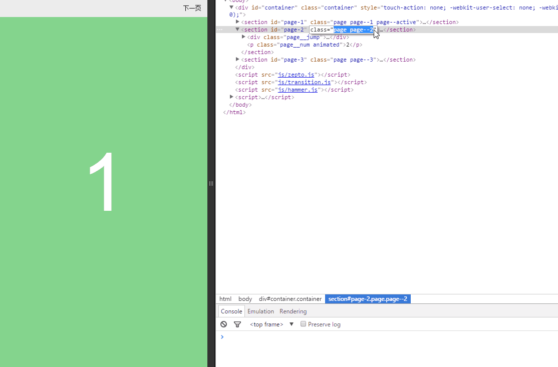 第一步,找到下一页的section,添加page--next类,将它定位当前页的右边,为滑屏做准备;