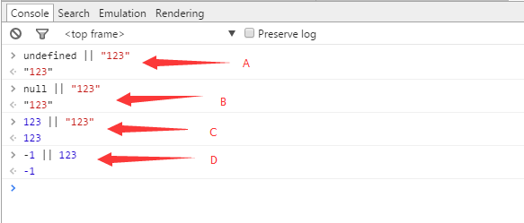 看图说话,A处,因为运算符左边未定义对象,所以返回 右边的值;B处,因为左边是空对象,所以返回右边的值;C处,因为左边有实在的值 数字123,所以返回123;D处因为左边是实在的值 数字-1,所以返回左边的值。补充一条:数0也是个特殊值,如果左边是0,那么就会返回右为的值。