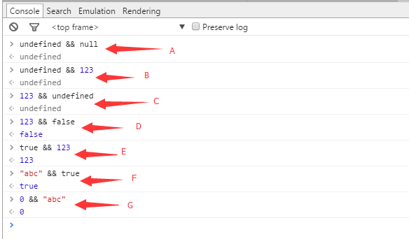 仍然看图说话,A处:左右分别为未定义对象和空对象,返回左边的值;B处左边是空对象,所以返回左边;C处:右边是未定义对象,所以返回右边值;D处:与C处同理;E处:两都是非空对象,左边的布尔值是true,所以返回右边;F处与E处同理;G处:因为左边是0,与未定义对象,空对象以及false同级,所以返回左边值。