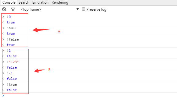 继续看图说话,A处:操作是0 false null 未定义之类的值,取返,就获得了布尔值的true;B处:都是对实实在在的值取反操作,获得的主是布尔值false。我们可以总结出,取反获得的就是布尔值,不实际的值取反就是正确,实际的值取反就是错误。