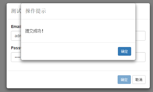 当email输入admin@admin 的时候,会给出提交成功的提示,确定之后就会关闭所有的弹框:
