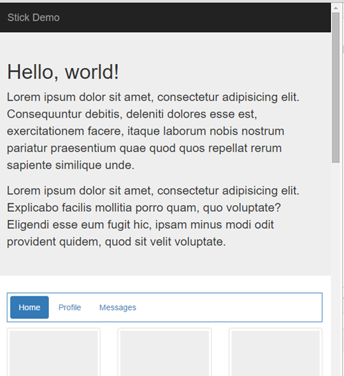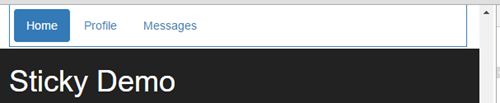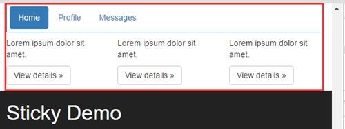 <div class="container-fluid sticky-wrapper"> <ul id="sticky" data-target="#main-container" class="sticky nav nav-pills"> <li role="presentation" class="active"><a href="#">Home</a></li> <li role="presentation"><a href="#">Profile</a></li> <li role="presentation"><a href="#">Messages</a></li> </ul> </div> <div id="main-container" class="container-fluid"> <div class="row"> ... </div> ... </div>