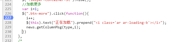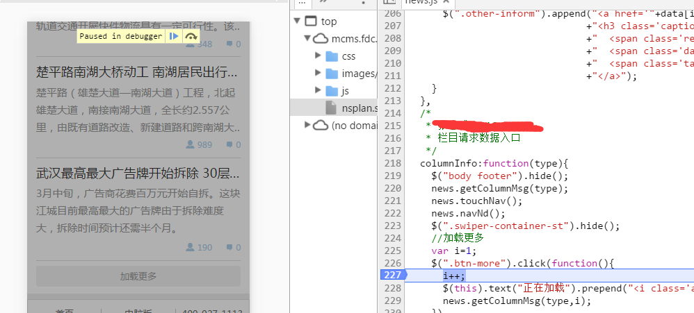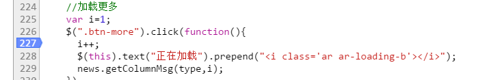 继续正题,上面的图就是点击加载更多按钮后的情况,我们可以看到左侧的页面被一个半透明的层给盖住了,页面上方还有一串英文和两个按钮,右侧代码227行被添加上了背景色,出现这个情况,先不管那些按钮英文是啥意思有啥作用,你从这个图得到了什么信息?继续琢磨琢磨~