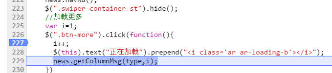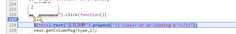 1.仍然是在227行打上断点 → 2. 点击加载更多按钮 → 3. 单击一次“逐语句执行“按钮,js代码执行到228行 → 4.用鼠标选中i++(什么叫选中大家里不理解?就是你要复制一个东西,是不是要选中它?对,就是这个选中) → 5. 选中以后,鼠标悬浮在目标上方,你就看到上图的结果。