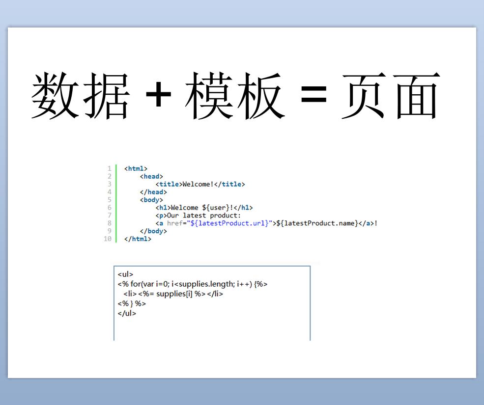 首先从一个重要的概念“模板”说起。 广义上来说,web中的模板就是填充数据后可以生成文件的页面。 严格意义上来说,应该是模板引擎利用特定格式的文件和所提供的数据编译生成页面。模板大致分为前端模板(如ejs)和后端模板(如freemarker)分别在浏览器端和服务器端编译。