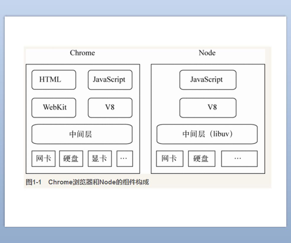 由于当场有一部分同学对node.js并不是很了解,这里补充一下node.js的相关知识。官网上的给他的定义事件驱动、异步什么的就不说了。这里借用朴灵书上的一张图来解释一下node.js这个玩意的结构。如果懂java的同学可以将其理解为js版本的jvm。 浏览器一般包括渲染器和js脚本引擎,以chrome浏览器为例,用的webkit内核的渲染器,V8的脚本引擎,而node.js用到了v8引擎。总而言之它就是一个js的运行环境,就好比浏览器的F12调试工具,只不过node.js没有DOM和BOM。
