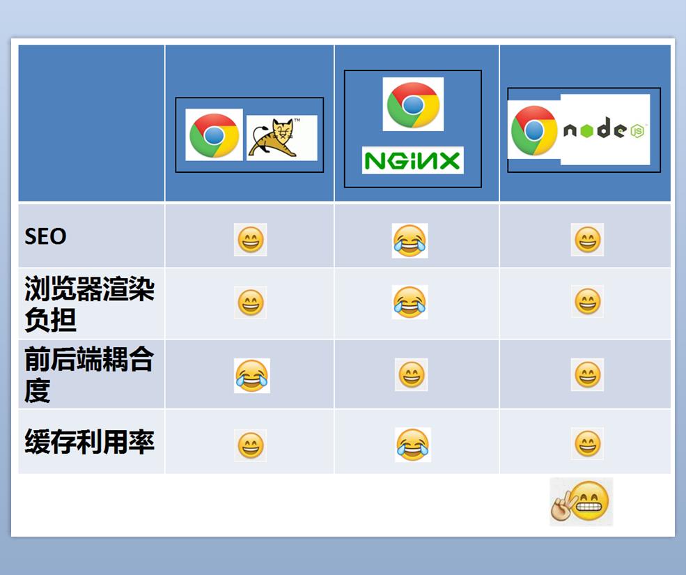 言归正传,这个表格列出了我所接触过的3种前后端分离的开发方式。 第一种是最常见的使用java之类的后端语言模板,SEO友好,缓存利用率和减轻浏览器渲染负担方面都比较好,最大的问题就是模板文件的耦合度太高,出了问题谁都不想来解决,前端人员看不到数据,后端人员不懂页面,模板文件就像是一个烫手的山芋。 第二种是目前我们项目移动端的实现方案,利用angular这种框架(angular的指令可以看成是前端模板)和nginx这种反向代理服务器,让前后端彻底解耦,只通过ajax交互数据。这种方案和前一种的优缺点刚好相反。前端模板的性能始终是个问题,尤其是在移动端,更尤其是在低端的移动设备上。 最后一种是新项目使用的用node.js做前端服务器,将前端的职责从浏览器划分到了模板这一层,解决了以上所有的问题,不过确实也有新的问题,这种问题稍后再分析。
