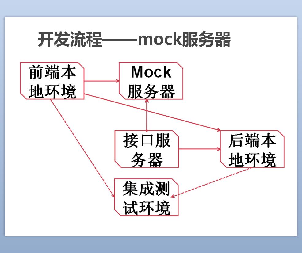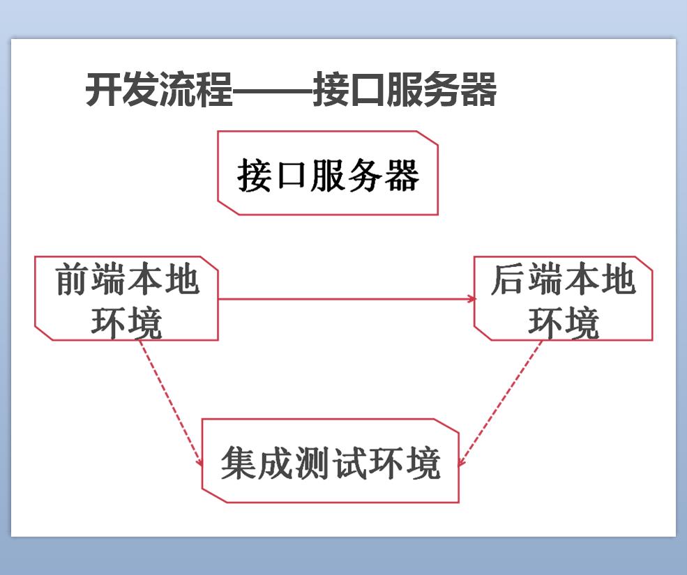 如果这次分享主要是讲怎样将node.js做为前端服务器来实现前后端分离的话那也没什么好讲的,看看淘宝UED的文章就好了。前后端分离其实最大的问题是带来沟通成本的上升,具体来说就是接口的定义和调试。在上图的传统开发流程中,接口的定义会放在接口服务器中,然后前后端各自根据接口文档造假数据进行本地调试,之后进行联调。这个环节就是前后端开始撕逼的时候了,这个参数不对,那个返回值不对,总之很浪费时间。接下来看这个问题在我们项目中是怎么解决的~
