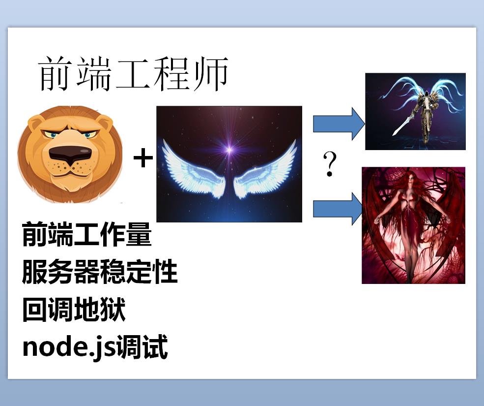 node.js是前端工程师的翅膀,而插上翅膀是变成天使还是变成恶魔?这个要看能不能解决的使用它时带来的问题了。
