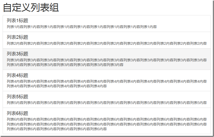 <h1>自定义列表组</h1> <ul class="list-group"> <a class="list-group-item"> <h4 class="list-group-item-heading">列表1标题</h4> <p class="list-group-item-text">列表1内容列表1内容列表1内容列表1内容列表1内容列表1内容列表1内容列表1内容列表1内容</p> </a> <a class="list-group-item"> <h4 class="list-group-item-heading">列表2标题</h4> <p class="list-group-item-text">列表2内容列表2内容列表2内容列表2内容列表2内容列表2内容列表2内容列表2内容列表2内容列表2内容列表2内容列表2内容</p> </a> <a class="list-group-item"> <h4 class="list-group-item-heading">列表3标题</h4> <p class="list-group-item-text">列表3内容列表3内容列表3内容列表3内容列表3内容列表3内容列表3内容列表3内容列表3内容列表3内容列表3内容列表3内容列表3内容列表3内容列表3内容列表3内容列表3内容列表3内容列表3内容</p> </a> <a class="list-group-item"> <h4 class="list-group-item-heading">列表4标题</h4> <p class="list-group-item-text">列表4内容列表4内容列表4内容列表4内容列表4内容列表4内容列表4内容列表4内容列表4内容列表4内容列表4内容列表4内容列表4内容列表4内容列表4内容列表4内容列表4内容列表4内容</p> </a> <a class="list-group-item"> <h4 class="list-group-item-heading">列表5标题</h4> <p class="list-group-item-text">列表5内容列表5内容列表5内容列表5内容列表5内容列表5内容列表5内容列表5内容列表5内容列表5内容列表5内容列表5内容</p> </a> <a class="list-group-item"> <h4 class="list-group-item-heading">列表6标题</h4> <p class="list-group-item-text">列表6内容列表6内容列表6内容列表6内容列表6内容列表6内容列表6内容列表6内容列表6内容列表6内容列表6内容列表6内容列表6内容列表6内容列表6内容列表6内容列表6内容列表6内容列表6内容列表6内容列表6内容列表6内容列表6内容列表6内容列表6内容列表6内容列表6内容列表6内容列表6内容列表6内容</p> </a> </ul>