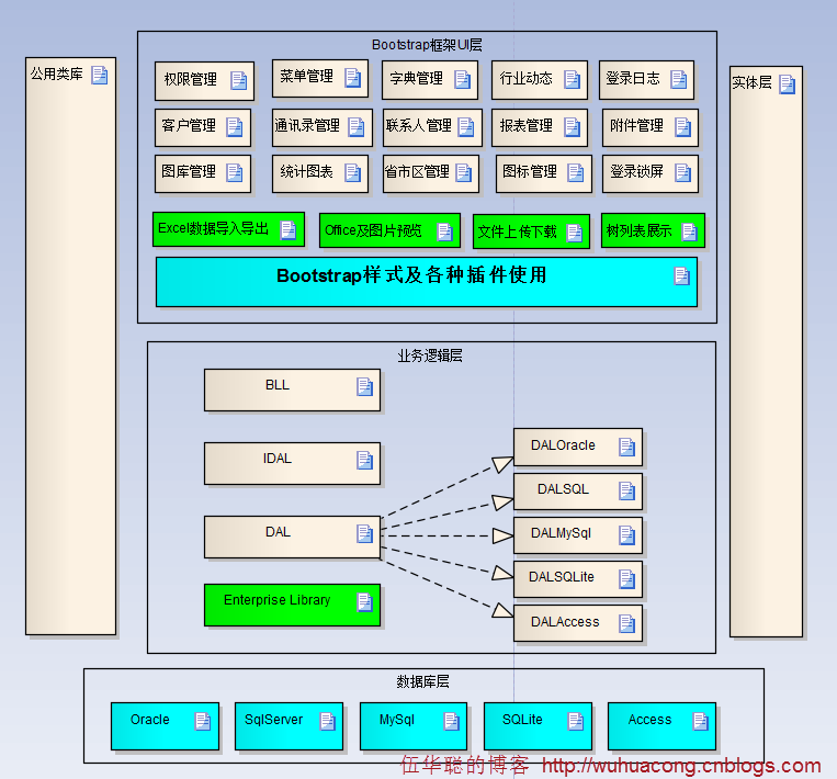 框架后台采用基于C#的MVC技术,是目前.NET开发最为成熟流行的技术,框架后台数据库支持Oracle、SqlServer、MySql、Sqlite、Access等常规数据库,可通过配置进行自由切换,使用Enterprise Library模块进行数据访问的控制,使得数据访问更方便轻松。