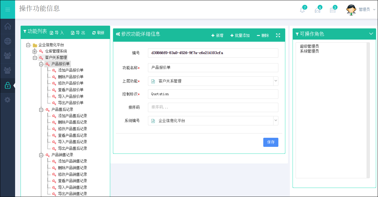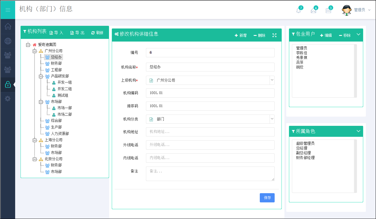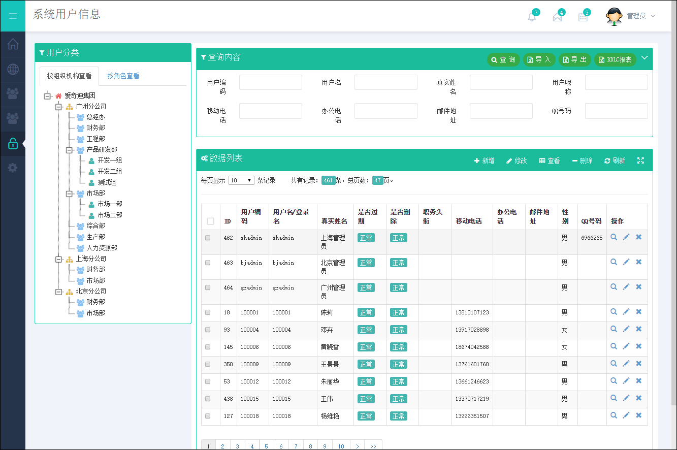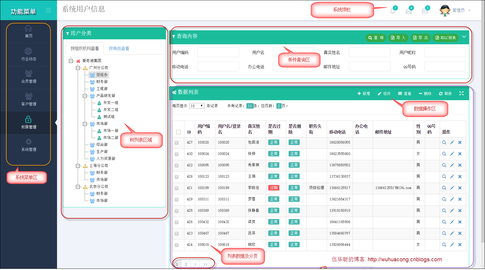 【系统菜单栏】的内容,是动态从数据库里面获取的菜单;【系统顶栏】放置一些信息展示,以及提供用户对个人数据快速处理,如查看个人信息、注销、锁屏等操作内容;内容区一般包括【树列表区】、【条件查询区】和【列表数据及分页】内容,内容区域主要是可视化展示的数据,可以通过树列表控件、表格控件进行展示,一般数据还有增删改查、以及分页的需要,因此需要整合各种功能的处理。另外,用户的数据,除了查询展示外,还需要有导入、导出等相关操作,这些是常规性的数据处理功能。
