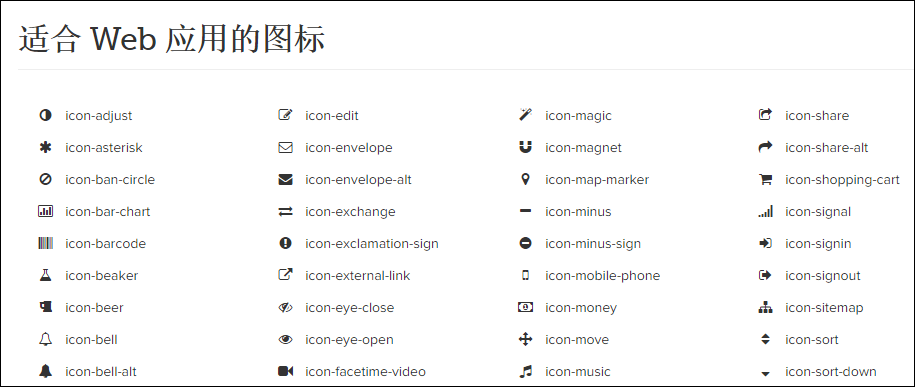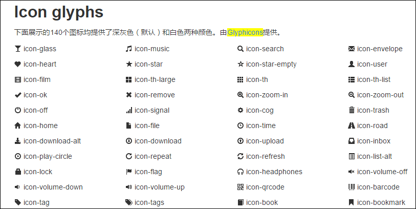 Glyphicons:包括200个符号字体格式图表集合,由Glyphicons提供,Glyphicons Halflings 一般是收费的,但是经过Bootstrap和Glyphicons作者之间的协商,允许开发人员不需要支付费用即可使用。