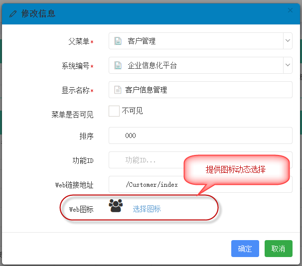如上面的编辑界面,对菜单的Web图标提供了动态的选择,那么我们如果数据库里面记录了上面几种图标的集合,那么我们就可以把它在界面进行展示,并可以从中选择合适的图表了。