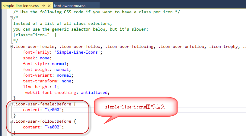 而对于simple-line-icons来说,它的样式定义也差不多,如下所示。