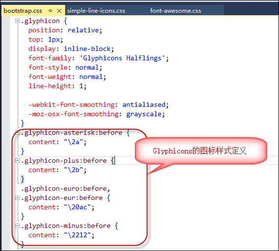 对于Glyphicons来说,它的样式定义也是很类似的,如下所示。