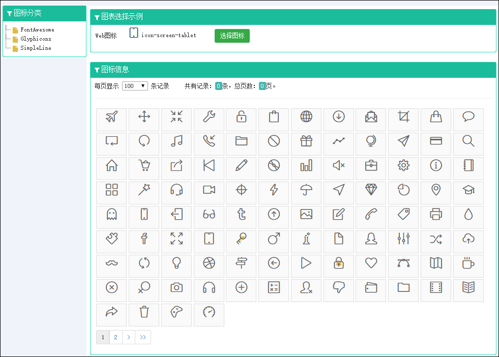 我们通过文件读取并以正则表达式提取出内容,然后保存到数据库后,这些图标信息就可以为我们使用了,可以在页面里面分类显示出来,每类的图标进行分页处理,方便查询,如下所示。