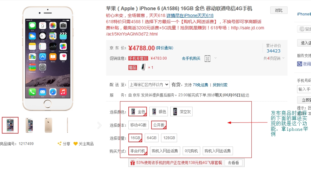 电商网站的商品发布功能,类似京东的商品详细页,如下图,这样的可选择功能,在后台是如何生成的呢,其实你看到的一个iphone6在发布时并不只是发布一个商品,而是很多个,因为每一个选择出来的iphone6价格是不一样的,那么发布商品时这些可选择项又是从一堆属性和属性值中挑选出来的,问题来了,发布时挑选的属性个数是不一样的,属性值也是不一样的,那么生成的商品个数是根据属性和属性值组合出来的。