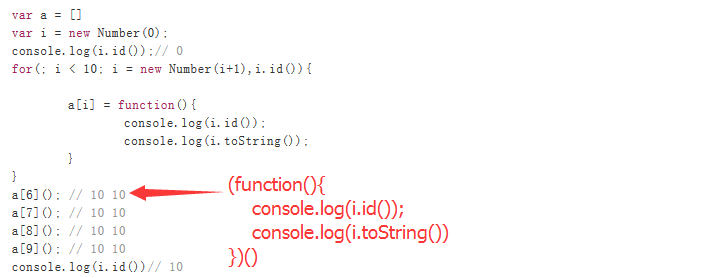 由于这个立即执行函数引用着数值0~9,当我们执行函数a[i]的时候,会顺着作用域链先找到这个立即执行函数的作用域.立即执行函数维护着0~9的数值引用,我们就可以在函数a[i]中正确的输出i的值.通过执行结果,我们可以看到,不光执行结果是对的,同时我们引用的值的相对内存地址也都是对的.接着我们把原来为了测试显式声明的Number对象改回去.如下: