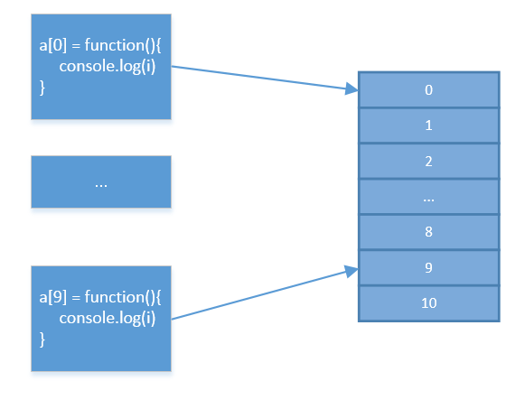 function中不存在i,于是顺着作用域链去window作用域找得到了i.我们这个时候输出的i就是这个i.由于i在跳出循环最后一次的+1,使得i变成了10,所以输出结果一直都是10.但是我们真正需要的i不是最后的i,而是中间过程中的i.如果要解决这个问题,我们需要抛开i这个变量(因为最后的i不可避免的变成10).我们要让a[0]对应的function引用0这个值,让a[1]对应的function引用1这个值.如下图所示: